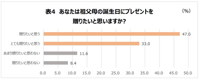 祖父母の誕生日にプレゼントを贈りたいと思うかという質問に対しては47.0%が「贈りたいと思う」、33.0%が「とても贈りたいと思う」と回答し、8割の子どもが祖父母にプレゼントをあげたいと思っていることが分かりました。