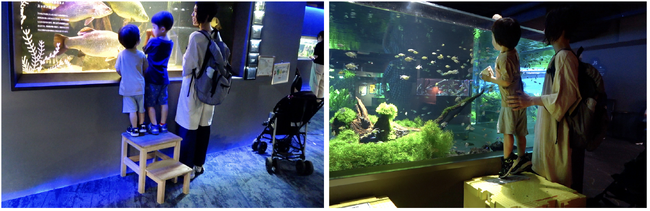 お子様が水槽を見やすいように館内には踏み台を多数ご用意しております。保護者さまが抱っこをし続ける必要なく、快適に生きものをじっくりと観察したり、エサやり体験をすることができます。