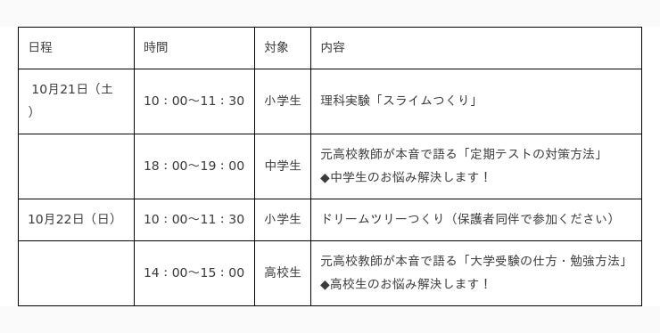 スクール・ワン蟹江教室では、開校記念キャンペーンとして、10月22日(日)までにお申込み、10月31日(火)までに授業を始められる方に、先着20名限定で「授業料2カ月分無料(※概要欄参照)」「入学金無料」などを実施。また、指導内容や教室の様子を体感できるイベント型の教室見学会を10月21日(土)・22日(日)に行います。参加特典として「勉強に役立つ冊子」や、QUOカードのプレゼント(1家族1枚、参加日ごとに500円分)もありますので、入塾をご検討の方は事前に電話でご予約の上、お気軽にご参加ください。