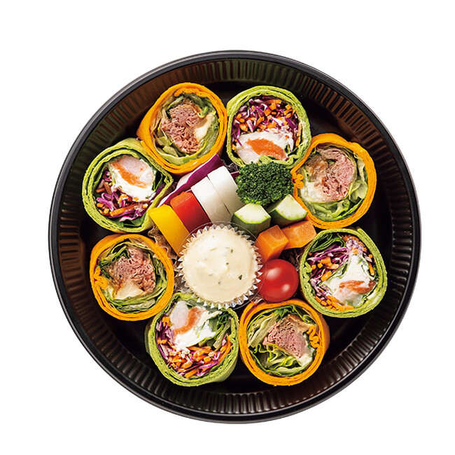 【内容】海老サーモンクリームチーズやローストビーフなどを巻いた2種類のトルティーヤとスティック野菜の盛り合わせで食卓を華やかに演出します。