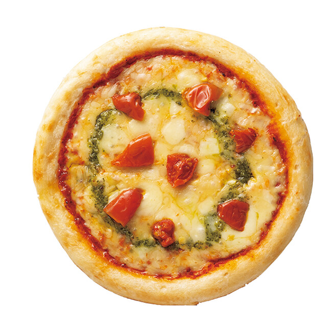 【内容】北海道産モッツァレラチーズをトッピングし、セミドライトマトとバジルソースを合わせたマルゲリータです。