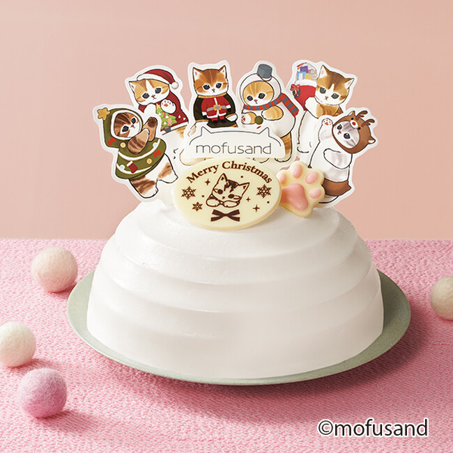 【内容】“mofusand”のにゃんこたちの紙ピックを自由にデコレーションできるドーム型ケーキです。ふんわりとしたスポンジにホイップクリームと苺ジャムをサンドし、オリジナルデザインのチョコプレートと、肉球形のチョコプレートを飾りました。