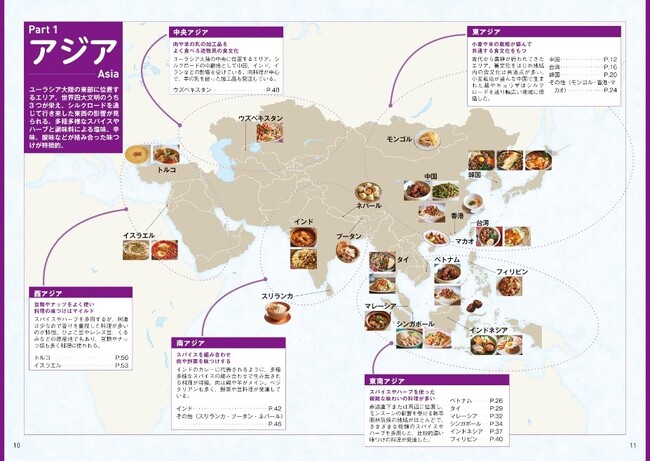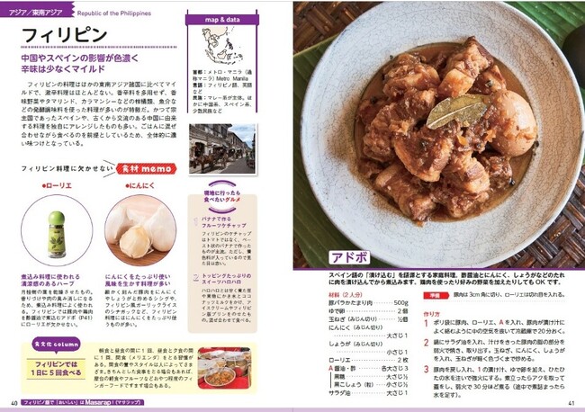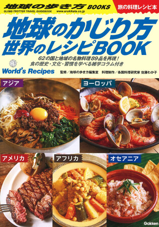 掲載レシピは、日本で入手できる食材&調味料を使って再現できるものばかり。アジア・ヨーロッパ・アメリカ・アフリカ・オセアニアのエリアごとに、62の国と地域の名物料理89品を厳選して紹介しています。食文化・食の歴史・食習慣など、現地取材データをもとにしたリアルな情報や、「食」に特化した世界の雑学も満載で、家にいながら海外旅行気分、外食気分を味わえると評判です。