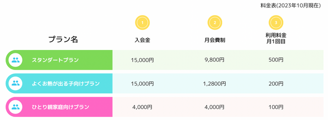 「万が一のための保険」のように月会費制を導入。また、ひとり親家庭へは利用しやすい料金設定をして、仕事と育児の両立をご支援します。10月末迄、特別入会キャンペーンを実施。入会金15000円、入会月の月会費を無料にします。加えて、ギフト券をプレゼントします。