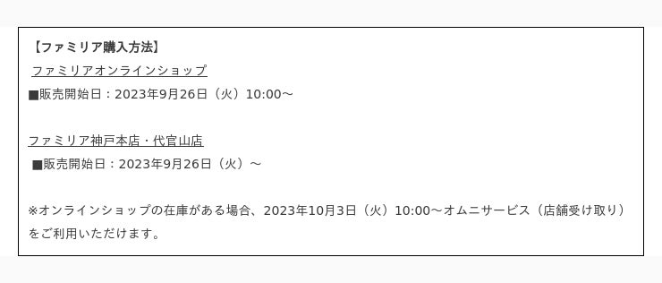 2023年9月26日(火)~ ファミリアオンラインショップ・神戸本店・代官山店にて順次販売