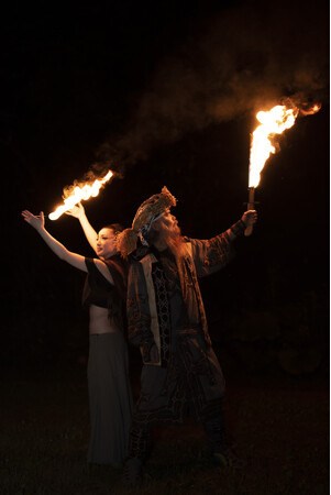 舞台の安全と成功を祈るお払いのような清めのダンス。ファイヤーバージョンでの演舞をお楽しみください。