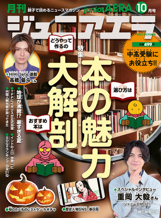 親子で楽しく読めて、中学受験・高校入試の勉強にも役立つニュース月刊誌「ジュニアエラ」10月号が、2023年9月14日(木)に発売されました。特集は、「本の魅力大解剖」。ニュース解説は、「地球が沸騰!? 暑すぎる夏」「インドの人口世界一に」などを掘り下げます。スペシャルインタビューには、映画「禁じられた遊び」で主演を務めた重岡大毅さんが登場。HiHi Jets連載は高橋優斗くんです。