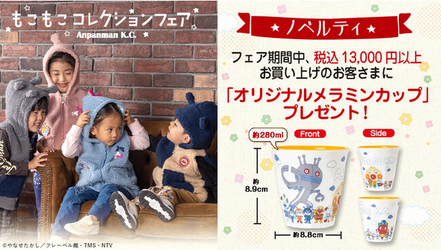 また、商品の発売にあわせて、店頭およびバンダイナムコグループ公式通販サイト「プレミアムバンダイ内アンパンマンキッズコレクションオンラインショップ」( https://p-bandai.jp/anpanman-kids/ )にて対象商品を13,000円(税込)以上お買い上げのお客様に「オリジナルメラミンカップ」をプレゼントするキャンペーンを実施いたします。