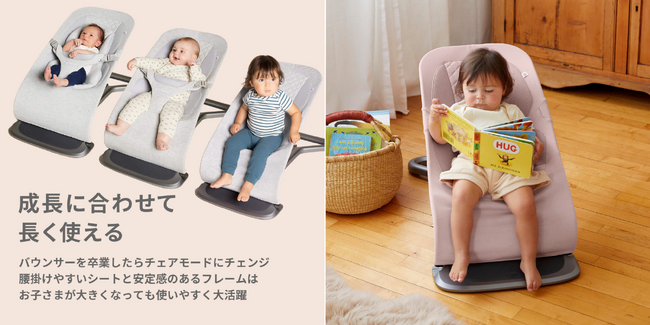 小さな頃はバウンサー、大きくなったらチェアモードで使用可能。深く腰掛けられるシートと安定感のあるフレームは、お子さまが大きくなっても使いやすく、長く活躍します。