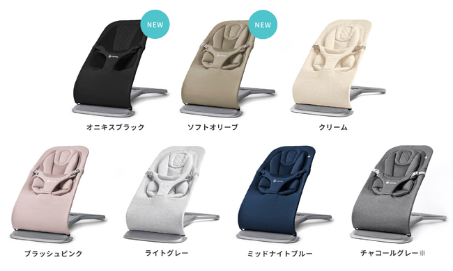 また、2023年9月15日にはevolve バウンサーの2つの新色、オニキスブラックとソフトオリーブも仲間入り。インテリアや好みに合わせてお選びいただけるカラーをラインナップしています。