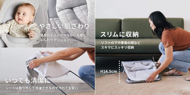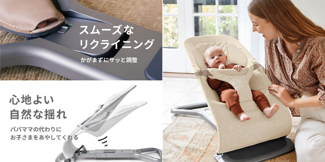 家事や仕事、趣味などずっと抱っこはしてあげられない時間に、バウンサーが代わりに『抱っこ』。おうちの中での抱っこが難しいシーンでも安心して任せられるように、赤ちゃんがごきげんに過ごせるための快適性を追求したバウンサーです。