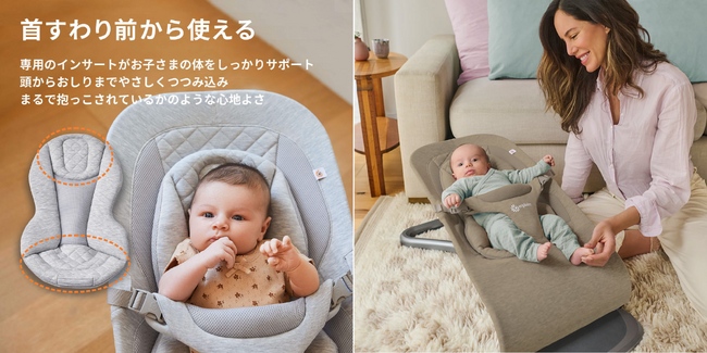 首すわり前の赤ちゃんの体はやわらかく、姿勢もまだまだ不安定。そんな時期でも安心してお使いいただけるように、専用のインサートが付属しています。頭をやさしく支える頭の丸みに合わせたくぼみ、お尻がずり落ちにくい座面の生地の切り替えで、抱っこされている時のような自然な姿勢でサポートします。