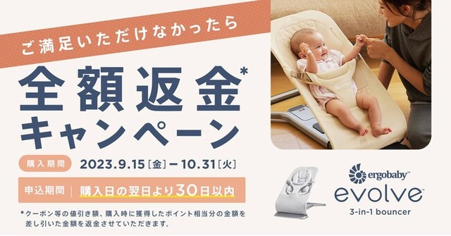 2023年9月15日から10月31日の期間にDADWAYの対象店舗でevolve バウンサーをご購入いただき、万が一ご満足いただけない場合には購入金額を返金いたします。返金申込は、ご購入日の翌日より30日以内。最大1カ月に渡って、じっくりと商品をお試しいただけます。赤ちゃんのために慎重に最適な育児用品を選びたいというパパママの想いに応えるキャンペーンです。