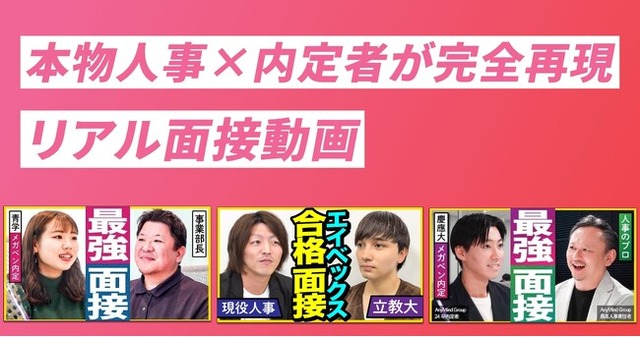 今回公開された動画では、エイベックス株式会社、AnyMindGroup、株式会社MIXIの面接官にご出演いただき、実際の面接官と内定を獲得した就活生が面接を完全再現しています。