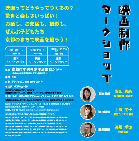 NPO法人キンダーフィルムフェスト・きょうと(理事長 藤原杏奈)は、小学生から高校生までを対象に「映画制作ワークショップ」を開催します。本ワークショップでは、講師として2名の映画監督とプロ劇団員を招聘し、秋の京都を舞台に合計5日間に渡って映画を制作していきます。脚本、演技、撮影、編集といった実際の映画制作でも必要な役割を本格的に体験できるとともに、学校や学年の壁を越え、日常生活では出会わない人やものに出会うことができるワークショップです。