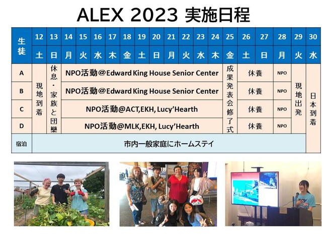 ALEXボランティアプログラムは昨年の実証実験に続く第1回の実施で、関西学院中学3年生3名と長崎南山高校1年生の4名が米国東海岸ロードアイランド州の4つのNPOでボランティア活動に参加しました。その傍ら、教会での礼拝や現地学校訪問、現地の市民への日本文化の紹介を行いました。4名の日程は下表の通りです。修了式の際には、ホストファミリーやNPOの人達の前で4人がそれぞれの体験を英語で発表し、大喝采を浴びました。