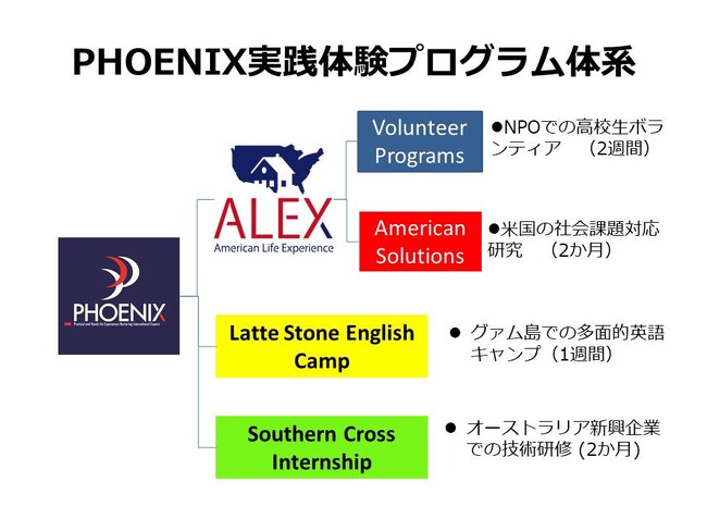 PHOENIXは"Practical and Hands-On Experiences Nurturing International Experts"の略称で、ジャイロスコープが創設した国際人育成に向けた実践体験プラットホームです。下図に示しましたように、現在PHOENIXの下、英語圏で実践活動に従事する四つのプログラムを立上げ中ですが、これらのうち、ALEX ボランティアプログラム第1回とラテストーン英語キャンプの実証実験を2023年8月に実行し、成功を収めることができました。