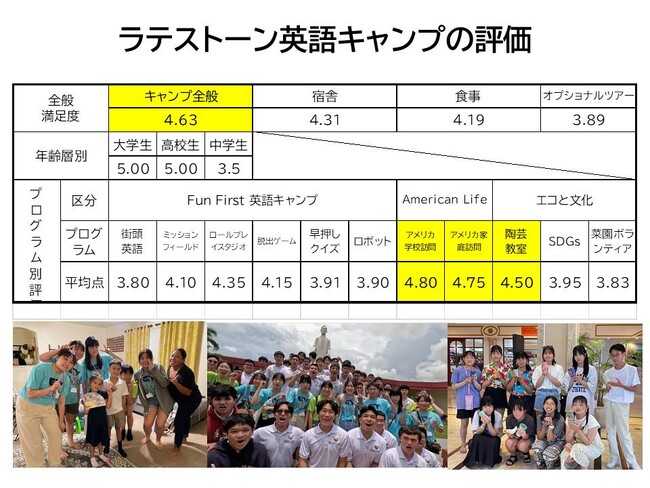 ラテストーン英語キャンプ参加者のアンケートの集計結果を下表に纏めました。参加者の内訳は大学生2名、キャンプの全体評価に於いて全員の平均点は5点満点中4.63点と5日間の英語キャンプに対する高い満足度が確認されました。また、プログラム別の評価では、10人中9人が現地高校を訪れたAmerican Classroomをもっとも良かったプログラムとして挙げ、American Home Visitと陶芸教室がこれに続きました。これらはすべて、英語を使って現地の人たちと直接交流する実践活動で、心温まる国際交流が高い評価を得ています。