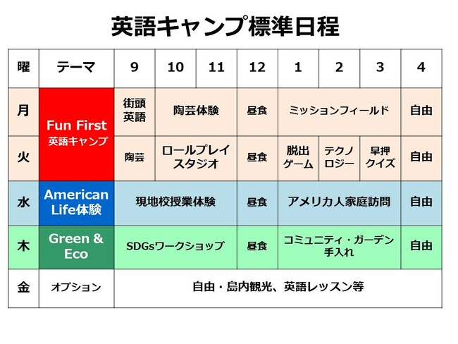 ラテストーン英語キャンプでは、私たちが得意とする楽しさ主導の英語キャンプに、アメリカ生活体験とSDGsの三つの要素からなる複合的国際人養成プログラムです。標準日程は下表の通りです。