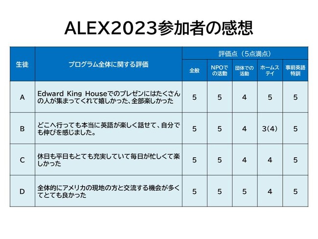 ALEX終了時に4名の生徒からアンケートを回収しましたが、その結果を下表にまとめます。全ての項目に亘って高い評価を頂き、アメリカでの二週間が生徒達にとって、充実して価値あるものであったことが分かります。