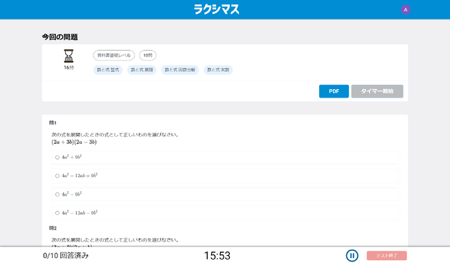 ラクシマスは、指定した単元から基本問題10問のセットを自動作成できる高校生向けの数学学習サービスで、2022年に公開されました。作成した問題セットは、その場でタイマー付きのテスト・採点・解説つきの見直しまで行えます。本サービスは、Googleのアカウントがあれば誰でも無料で利用することができます。