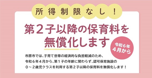 国が実施している制度は、3~5歳児クラスの児童について保育料無償化、0~2歳児クラスの児童については、保育所等を利用する最年長の子供を第1子とカウントしたうえで、第2子は半額、第3子以降を無償としておりますが、市原市独自の子育て支援策として、第1子の年齢制限を撤廃し、0~2歳児クラスのすべての児童の保育料を無償化します。