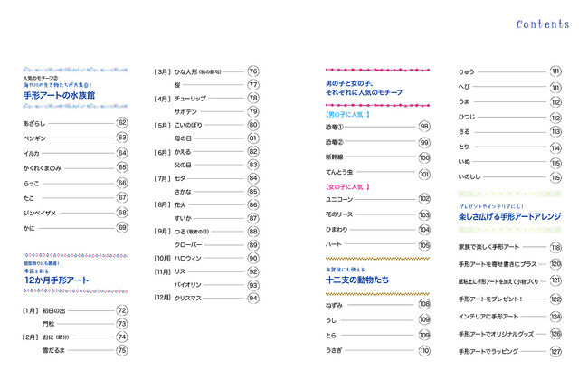 本書は手形アートの作り方や楽しみ方、人気のモチーフアイデアを紹介する一冊です。