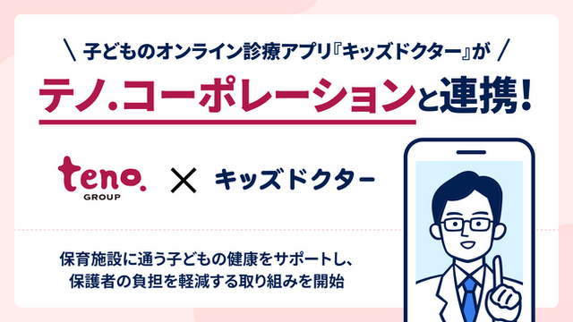 株式会社ノーススター(本社:東京都中央区、代表取締役社長:田北 浩大、以下「ノーススター」)は、株式会社テノ. コーポレーション(本社:福岡県福岡市 代表取締役:池内 比呂子、以下「テノ. コーポレーション」)と連携し、ノーススターが運営する小児のオンライン診療アプリ『キッズドクター』とテノ. コーポレーションとで、保護者が保育園に預ける上で抱える健康不安を解決できる体制を構築いたします。
