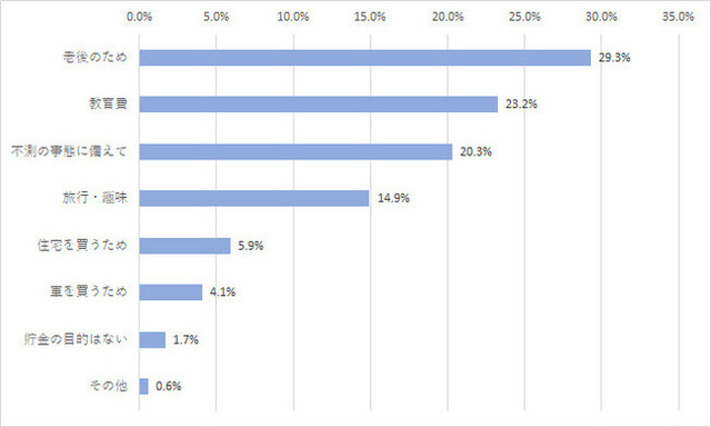 「老後のため 29.3%(208人)」「教育費 23.2%(165人)」「不測の事態に備えて 20.3%(144人)」「旅行・趣味 14.9%(106人)」「住宅を買うため 5.9%(42人)」「車を買うため 4.1%(29人)」「貯金の目的はない 1.7%(12人)」「その他 0.6%(4人)」という結果になりました。