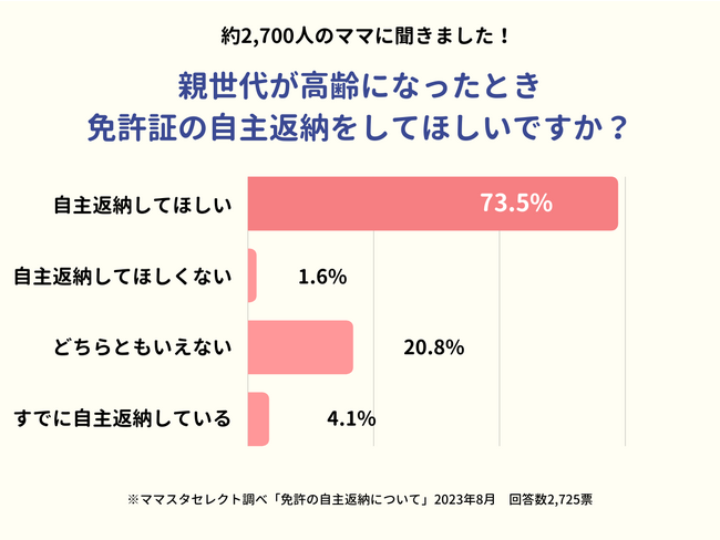 選択肢には「自主返納してほしい」「自主返納してほしくない」「どちらともいえない」「すでに自主返納している」の4つを設定、2,700人を超える回答が寄せられました。