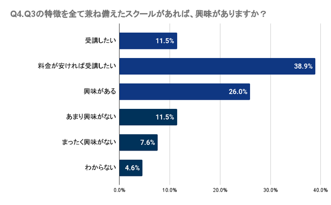 Q4で「Q3の特徴を全て兼ね備えたスクールがあれば、興味がありますか?」と質問したところ、山口県では11.5%が受講を希望し、38.9%は料金が手頃であれば受講したいと考えています。さらに、26.0%は興味を示していると回答しました。多くの人がこのような特徴を持つスクールに一定の興味を示していることが分かります。