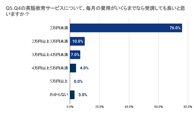 Q4で「受講したい」「料金が安ければ受講したい」「興味がある」と回答した人に、Q5で、「Q4の英語教育サービスについて、毎月の費用がいくらまでなら受講しても良いと思いますか?」と質問したところ、最も多い76.0%の回答者は2万円未満が適切と感じています。10.0%は2万円以上3万円未満、7.0%は3万円以上4万円未満と答えました。対照的に、4万円以上の費用を考える回答者は極少数で、4万円以上5万円未満が4.0%、5万円以上が0.0%でした。これにより、山口県では多くの人が3万円未満の価格帯を望んでいることが明らかとなりました。