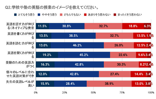 Q1・Q2では、子どもが英会話スクールや英語塾に通っていたが英語力アップの効果を感じていない人が一定数いること、学校や塾の英語の授業に対して明確な効果や良い印象を持てていない人が多いことが明らかになりました。