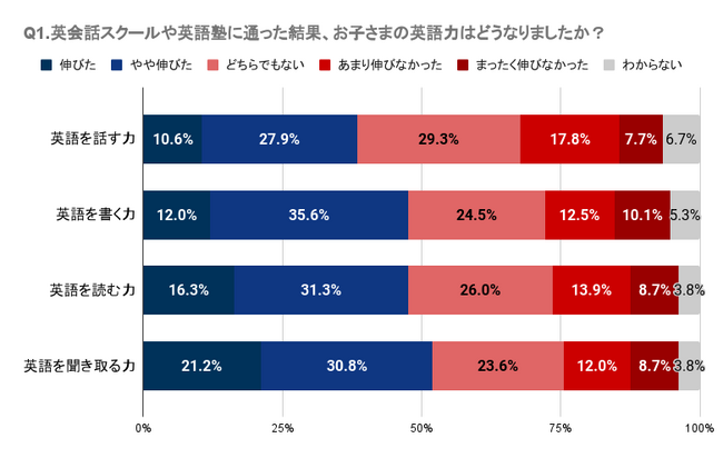 Q1で「英会話スクール、英語塾に通った結果、お子さまの英語力はどうなりましたか?」と質問したところ、山口県では英会話スクールや塾に通って英語のスキル向上を明確に感じられなかったと感じている人が一定数いることが分かりました。具体的には、英語を話す、書く、読む、聞き取る各スキルにおいて、「伸びた」と感じる人は10.6%~21.2%であり、一方で「あまり伸びなかった」や「まったく伸びなかった」と回答した人が合わせて20.7%~25.5%となっています。特に、「英語を話す力」と「英語を書く力」においては「あまり伸びなかった」と「まったく伸びなかった」の合計がそれぞれ25.5%、22.6%となっています。また、各スキルに関して「どちらでもない」と答えた人も含めると、44.2%~54.8%となっており、明確な効果を実感していない人が一定数存在することが伺えます。