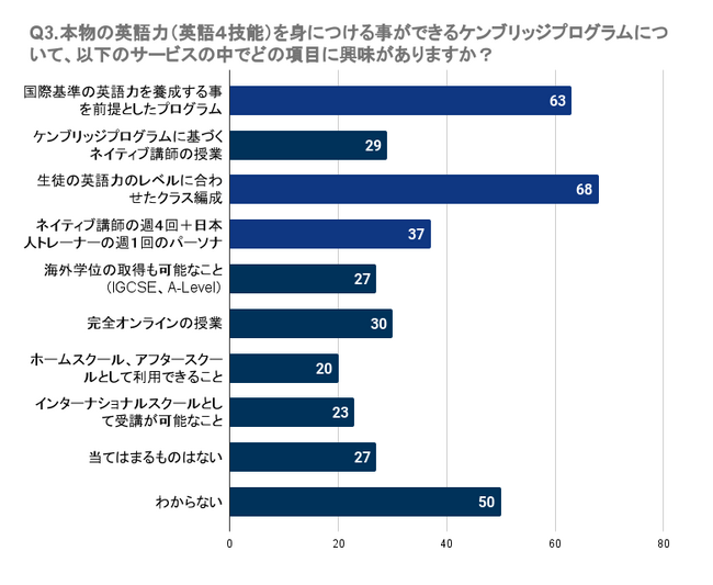 Q3で「本物の英語力(英語4技能)を身につける事ができるケンブリッジプログラムについて、以下のサービスの中でどの項目に興味がありますか?(複数回答可)」と質問したところ、山口県で最も多かったのは「生徒の英語力のレベルに合わせたクラス編成」で68名でした。次いで、「国際基準の英語力を養成する事を前提としたプログラム」には63名、「ネイティブ講師の週4回+日本人トレーナーの週1回のパーソナルトレーニング」には37名が興味を持っています。一方で、「インターナショナルスクールとして受講が可能なこと」や「ホームスクール、アフタースクールとして利用できること」に関心を持つ人はやや少なめで、それぞれ23名、20名の回答でした。これらの結果から、多くの人は実用的な英語力の養成や個別のニーズに応じた指導に重きを置いていることが伺えます。