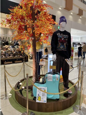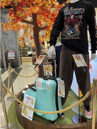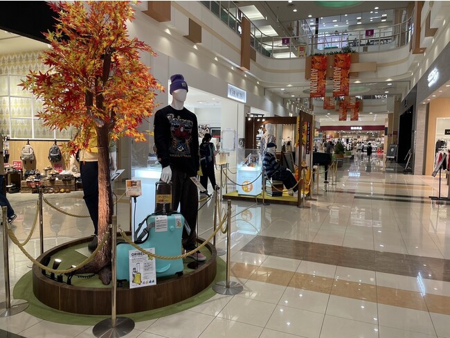 問題解決型のスーツケース(キャリーケース)ORIBELAがイオン札幌発寒店の「秋の行楽フェア」VPに選定されました。限定色のグリーンティを展示しております。