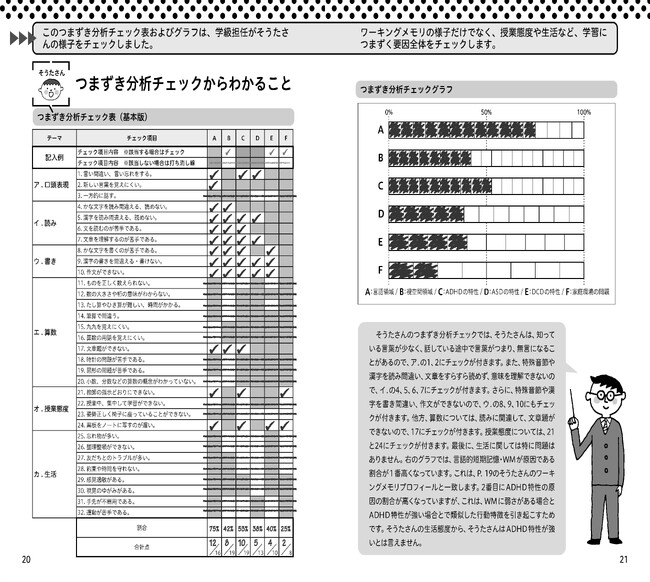 子どもが学習または行動面でつまずいているとき、その原因の一つにワーキングメモリの弱さがあることがあります。ワーキングメモリやそのほかの原因を多面的にみとり、それに応じて支援することが大切です。本書ではシートを使って、普段の子どもの姿から「つまずき分析チェック」が5分程度ででき、具体的な支援を考えていけるようにしました。