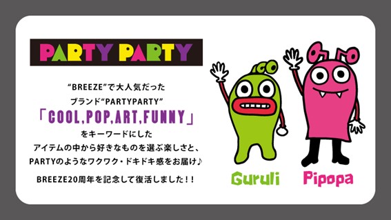 20周年を記念して、BREEZEでかつて展開していた大人気ブランド「PARTY PARTY」のメインキャラクターであるGURULI(ぐるり)とPIPOPA(ぴぽぱ)が復活。