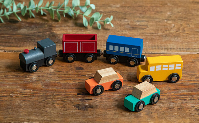 列車はクラシカルな「機関車」「客車」「貨物車」のデザイン。車両はそれぞれ磁石で連結して遊ぶことができます。貨物車に荷物を積んだり、客車だけを連結して電車のように見立てたり、工夫次第で様々な物語を想像しながら楽しめます。複数の商品を揃えれば、たくさんつなげて長い列車を作ることもできます。
