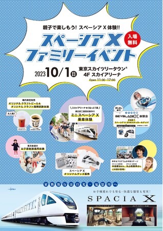 7月15日(土)の運行開始以来、大変ご好評をいただいているスペーシア Xですが、秋のお出かけシーズンを迎えるにあたり、その魅力をより多くのご家族連れに知っていただきたく、10月1日(日)に東京スカイツリータウン(R) 4F スカイアリーナにおいて「スペーシア X ファミリーイベント」を開催します。