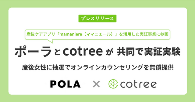 オンラインカウンセリング・コーチングの「cotree」を展開する株式会社cotree(本社:東京都港区、代表取締役:西岡 恵子、以下cotree)は、株式会社ポーラ(本社:東京都品川区、代表取締役:及川美紀、以下ポーラ) が提供する産後ケアアプリ「mamaniere(ママニエール)」を活用した実証事業に参画し、オンラインカウンセリングによる産後女性の心のサポートを、2023年12月末まで無料で行います。