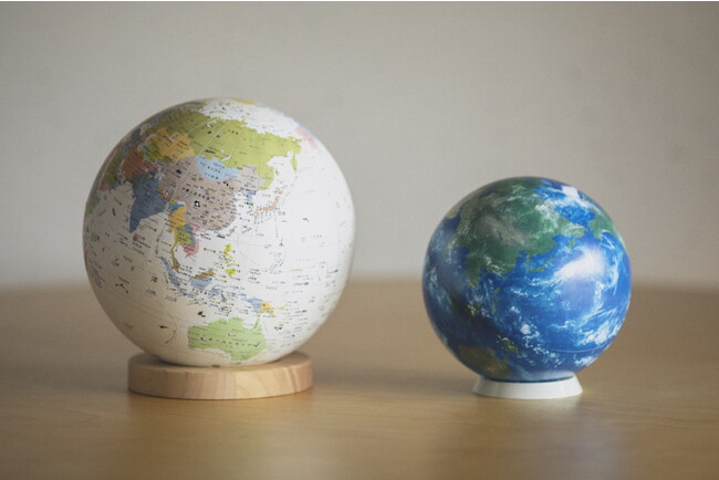 選べる地球儀本体は主に2種類。2020年11月発売のメインモデル(画像右)は、国境も国名もない宇宙から見た地球そのままの姿をした直径15cmの地球儀。2022年7月発売の「ほぼ日のアースボール ジャーニー」(画像左)は、世界の国々をカラフルに塗り分けし、精緻な地図を記載した直径20cmの本格地球儀モデルです。これに加えて、2022年11月、サッカーボールタイプの「ほぼ日のアイスボール PLAY」も限定生産で誕生しました。どのモデルも地球儀を固定する軸やアームがないので、転がしたり手でもったりできて、同じ専用アプリ(無料)でARコンテンツをたのしめます。