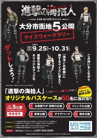 一般社団法人うみらいふは、2023年9月25日(月)より、ごみを拾いながら、海洋ごみにまつわるクイズに答えていくことで、海洋ごみ問題についての知識も深めることができる「進撃の海拾人 クイズウォークラリー」をスタートいたします。この「進撃の海拾人 クイズウォークラリー」では、「進撃の巨人」に登場するキャラクターが大分市街地の5つの公園(アクアパーク・お部屋ラボ 祝祭の広場・ジャングル公園・遊歩公園・若草公園)に期間限定でパネルとなって登場し、それぞれのキャラクターがクイズを出題する仕様となっており、パネルの二次元コードを読み込み、専用フォームより回答を送信してくれた方の中から抽選で、50名の方に「進撃の海拾人オリジナルパスケース」をプレゼントいたします。なお、パネル背面にはごみ袋が付属しており、ごみ拾いをしながらクイズウォークラリーに参加いただけます。