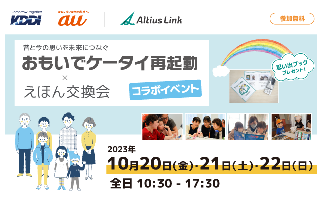 KDDI株式会社(本社:東京都千代田区、代表取締役社長CEO:高橋 誠、以下 KDDI)と、アルティウスリンク株式会社(所在地:東京都新宿区、代表取締役社長:網野 孝、以下 アルティウスリンク)は、電源の入らなくなったケータイを復活させる「おもいでケータイ再起動」と、思い出の詰まった本棚に眠る絵本や児童書を未来の子どもたちにリレーする「えほん交換会」のコラボイベントを北海道札幌市で2023年10月20日(金)・21日(土)・22日(日)に開催いたします。