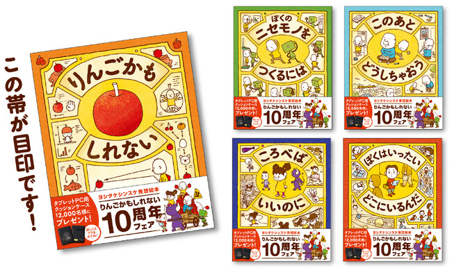 今回のキャンペーンでは、『りんごかもしれない』にはじまるヨシタケさんの「発想絵本シリーズ」を購入した方の中から、抽選で2,000名様に、ヨシタケさん描きおろしのイラストが入った特製タブレットPC用クッションケースをプレゼントします。