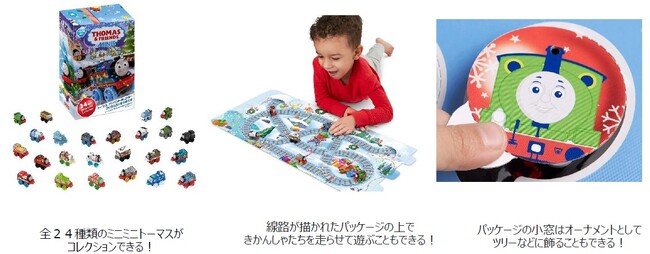 12月1日から24日まで、小窓をあけると毎日クリスマス限定デザインを含む24個の異なるミニミニトーマスが登場します。開けた小窓にひもを通してオーナメントとして飾ることもできます。パッケージはプレゼントをイメージした特別な仕様。スリーブが線路になっていて、線路が描かれたパッケージの上で、きかんしゃたちを走らせて遊ぶこともできます。