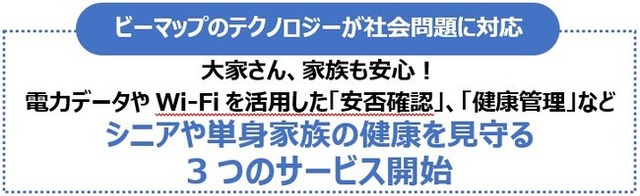 株式会社ビーマップ(本社:東京都千代田区、代表取締役社長:杉野 文則)は、「離れて暮らす家族の健康が心配」、「万が一を見逃さないよう見守りたい」など、一人暮らしの家族の健康や生活が心配な方を対象に、3つの『見守りサービス』を2023年10月より順次開始(予定)いたします。