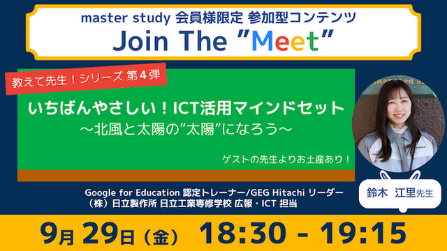 毎週金曜日18:30~19:00に Google Meet(TM) で開催中の「Join The “Meet”」。『教えて先生!シリーズ』は、特別回として15分拡大バージョン【18:30~19:15】でお送りします!