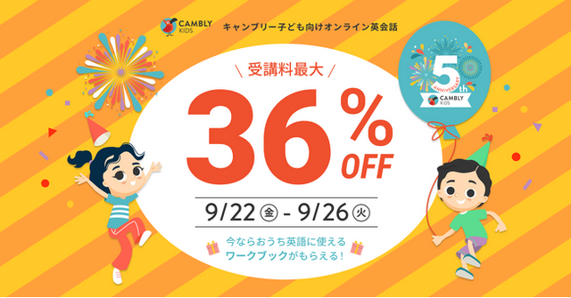 Cambly Inc.(本社:アメリカ・サンフランシスコ、日本代表:佐藤 亜希子)が提供する子ども向けオンライン英会話サービス「Cambly Kids(キャンブリー キッズ)」は、9月22日(金)から26日(火)までの5日間、全レッスンプラン最大36%OFFセールを開催します。