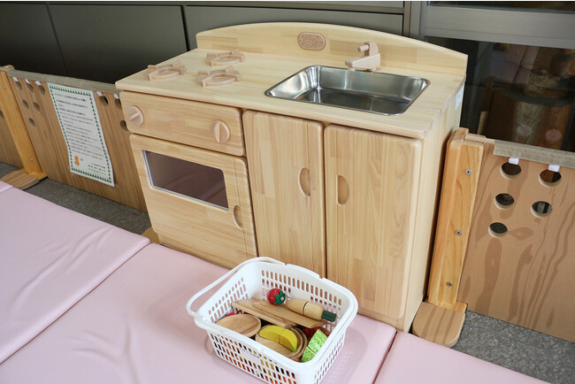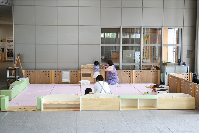 キッズスペースを設置するのは市役所東館の1階で、約16平方メートル のキッズスペースにはクッション性のあるマットを敷き詰め、ままごとセットや絵本、ぬいぐるみを備えるなど、幼い子どもが楽しんで過ごせるように工夫しました。おむつ交換や授乳のできる専用の部屋や子ども用便座などを備えた多目的トイレも近くに配置されています。